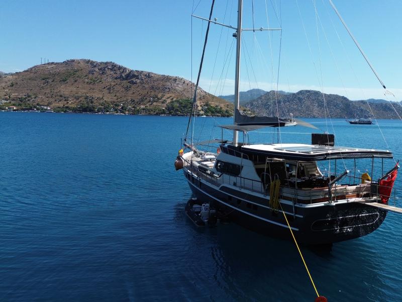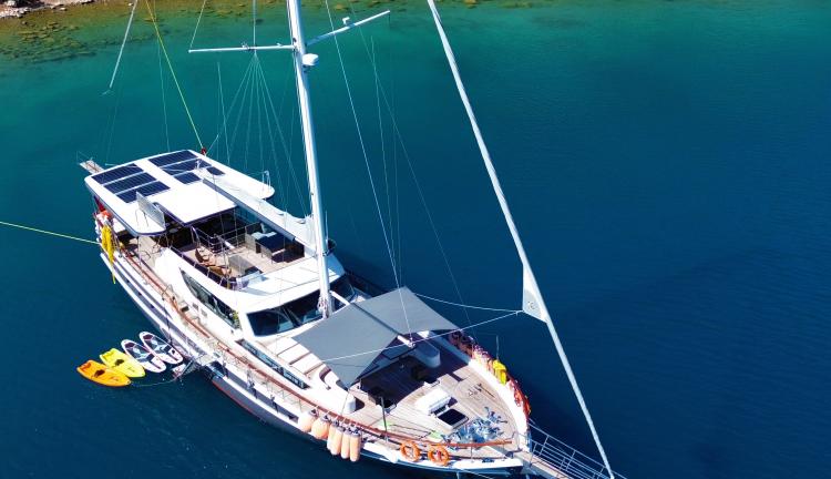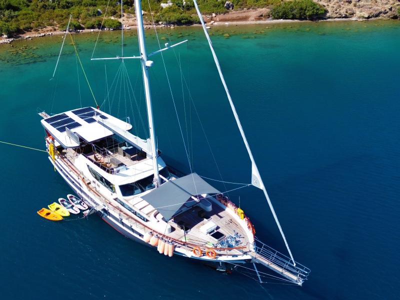 This 24 meter wooden yacht, featuring 4 beautifully appointed cabins, offers an intimate and elegant cruising experience for up to 8 guests. As one of the most refined options for Gocek yacht charter, this gulet stands out with its modern 2023 build, graceful lines, and warm wooden character.