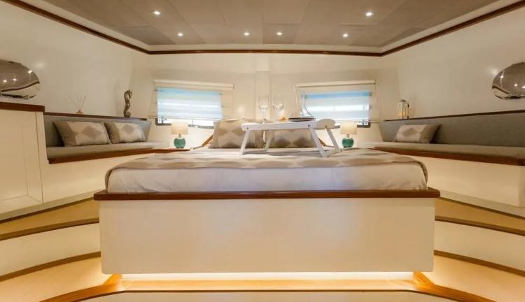 The gulet accommodates up to 8 guests across two master cabins and two double cabins. Each cabin is thoughtfully designed with amenities such as air conditioning and hairdryers, ensuring a comfortable and stylish stay. The elegant interior creates a warm and inviting atmosphere, while the expansive deck areas are perfect for sunbathing, dining, or simply enjoying panoramic sea views.