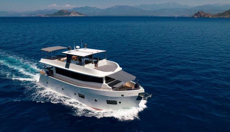 Oggusto is a stylish 22 meter trawler offering modern comfort, spacious outdoor areas and a relaxing blue cruise experience for up to 8 guests.